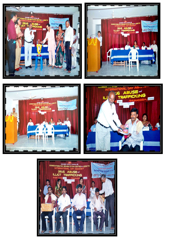 On 26th June 2010 Surabee Integrated Rehabilitation Centre for Addicts conducted International Day Against Drug Abuse and Illicit Trafficking programme, at Padaveedhara Sangha, Shimoga. In the presents of chief guests Dr. Aravind, Psychiatrist, Shimoga, Mr. Manjunath, Police inspector, Shimoga, and Project Director of Surabee IRCA, and all staffs of Surabee and beneficiaries were participated in the program.